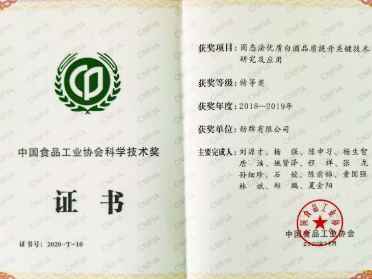 12月6日,2020第四届中国食品产业发展年会暨华糖万商大会全会在河南郑州开幕。大会颁发了2020年度“中国食品工业协会科学技术奖”,劲牌公司《固态法优质白酒品质提升关键技术研究及应用》项目荣获特等奖。
