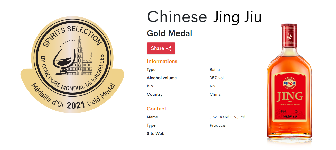 The latest San Francisco World Spirits Competition (“SFWSC”) 2021 just announced that, Jing Brand’s Maopu Yuqiao 48% and Gold Label Jing Jiu 38% won its Double Gold Award, Chinese Jing Jiu 35% won its Gold Award, and WHILUX Wholewheat Whisky 40% won its Silver Award.